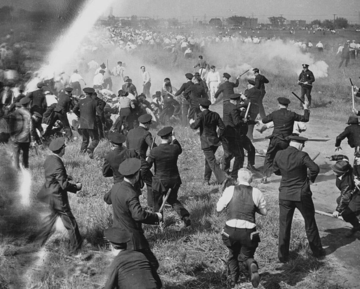 When workers want collective bargaining privileges in an attempt to make the workplace more democratic, is this celebrated as Americans adhering to our core values? No. Far from it. Historically this is met with outright militaristic violence. Our government has been very clear on this: Corporations, come what may, will continue operating as dictatorships. Now, liberals, who, if we’re really honest are the main pillar holding all this nonsense up, would love to argue they are somehow “prolabor”—just look at FDR and the New Deal, they invariably say. Only this is revisionist history.