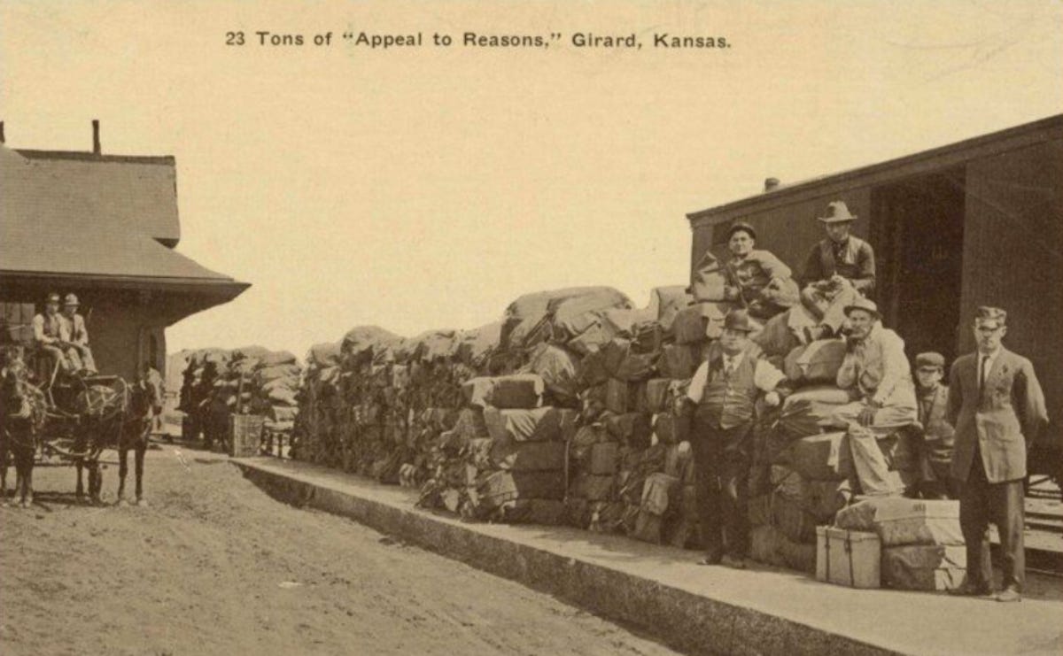 We are talking about a time when actual fighting in the streets over labor disputes was common, when the most popular political paper in America was the Appeal to Reason, a socialist paper published in little Girard, Kansas. (This is the paper that commissioned Sinclair’s The Jungle.) This was a time when the Teamsters were out there acting like the IRA, bombing vehicles and houses, when increasingly popular strikes would shut down entire cities and the military would be sent in to replace strikers with scab workers, often resulting in mass fatalities.